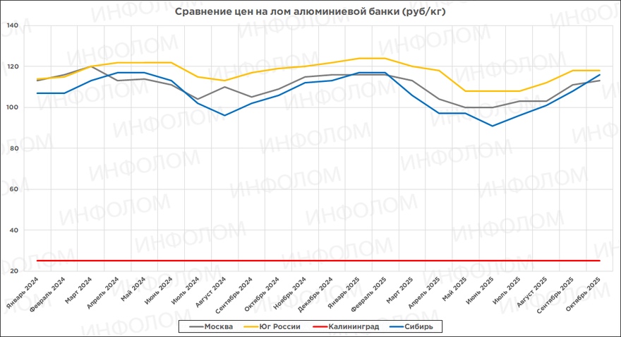 А вот рынок лома алюминиевой банки показал отличную доходность как раз по Сибири, где цена с июня по октябрь выросла почти на 20%, по Югу России напротив, колебания по лому алюминиевой банки наименьшие.