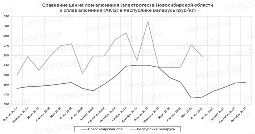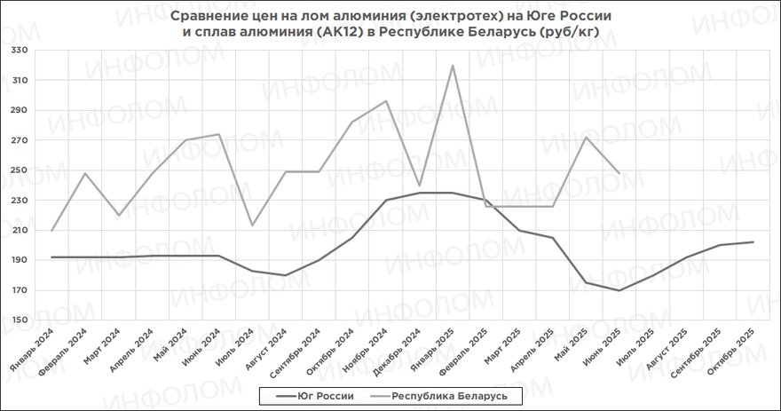 В силу большого количества потребителей колебания цен на лом алюминия в Москве незначительные. Для сравнения мы взяли также цену на АК12 на Белорусской универсальной товарной бирже, но после июля 2025 г. торгов по АК12 не было, только по более дешевым сплавам АК12М2