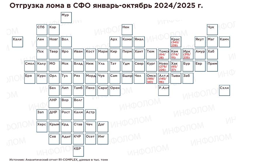 По итогам 10 месяцев года регионы Сибирского федерального округа демонстрируют устойчивую отрицательную динамику в сфере отгрузки металлического лома. Все без исключения субъекты СФО завершили отчетный период со значительным снижением объемов.
