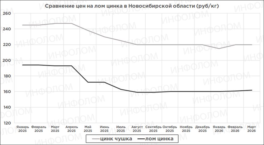 И наконец в Сибири за год установилась строгая система – цены на лом цинка и цены на цинковую чушку имеют стабильную разницу цен в 60 рублей на кг, а колебаний цен на чушку и на лом цинка практически нет. Цинковая чушка по 220 руб./кг – реальность нашего рынка на сегодня. И пока эта «электрическая цифра» — символ стабильности.